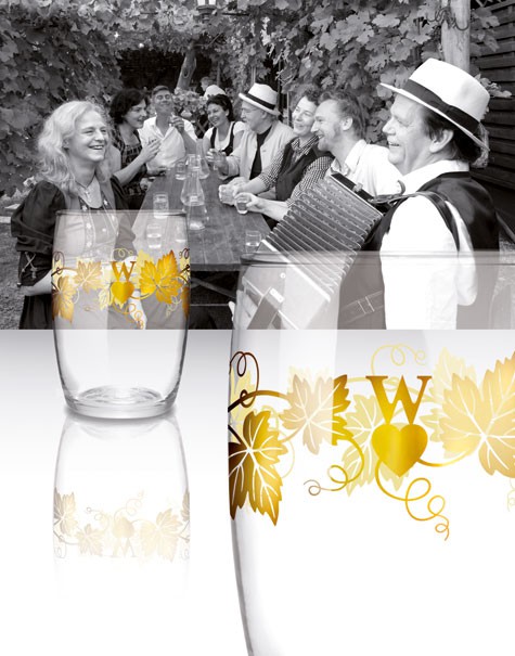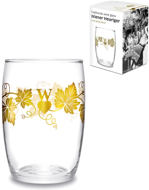 The ‘Fasslbecher’ with its typical, originally green pattern of vine leaves was the traditional wine glass at the ‘Heurigen’ of Vienna, places beloved for centuries for the convivial atmosphere and the Wienerlied (Viennese folk songs) in the vineyards on the outskirts of the city.